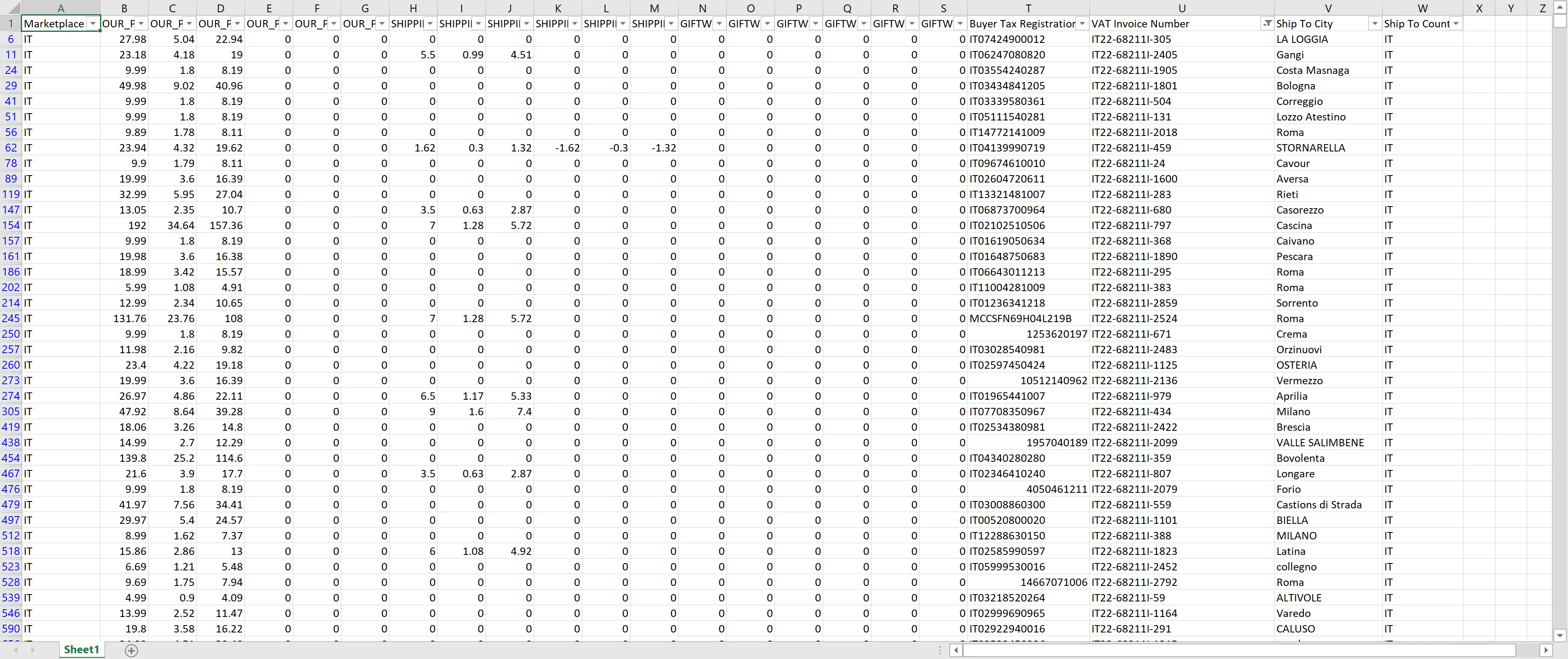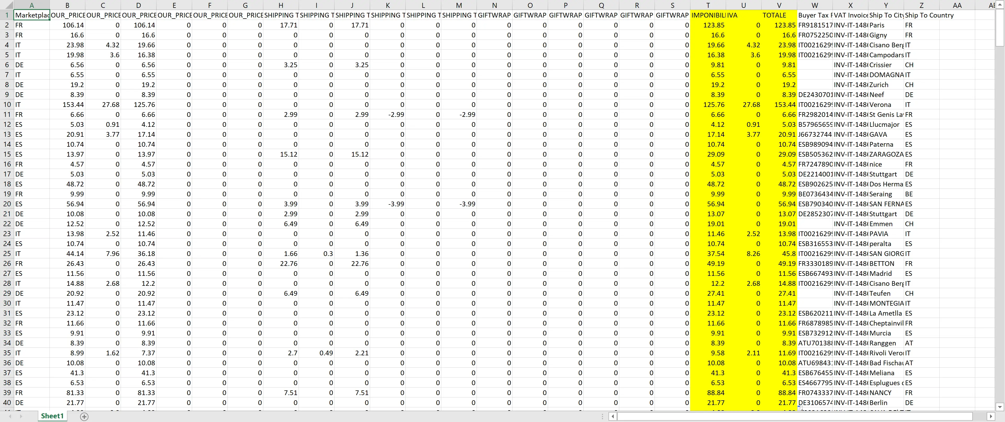 | Imponibile | OUR_PRICE Tax Exclusive Selling Price + OUR_PRICE Tax Exclusive Promo Amount + SHIPPING Tax Exclusive Selling Price + SHIPPING Tax Exclusive Promo Amount + GIFTWRAP Tax Exclusive Selling Price + GIFTWRAP Tax Exclusive Promo Amount |